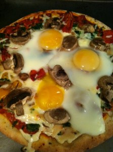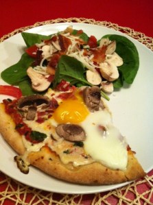 Sprucing up my Archer Farms Mediterranean pizza seemed simple enough. I added bacon, fresh mushrooms, mozzarella (in my opinion pizza can never be too cheesy) and halfway through the baking time I added three eggs as suggested.