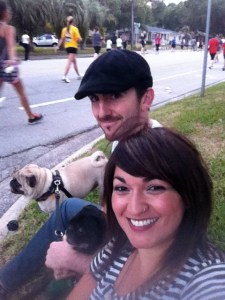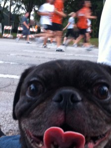 The race started at 7:15. I met Donnie around 7:40 on a grassy knoll on Livingston, where he had been sitting watching the runners with the unruly pugs.