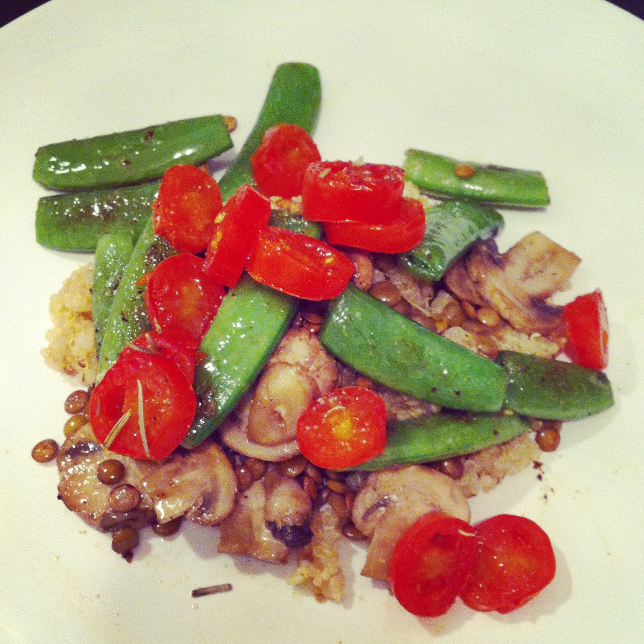 Donnie went to cooking the quinoa (per instructions on the package) and the mushrooms (sauteed with just a bit of olive oil) and the snap peas (same) while I prepped the tomatoes and walked around complaining how hungry I was. 🙂
