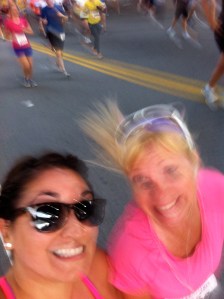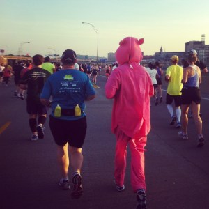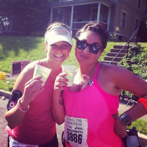 I was just starting to get in a groove and wanted to enjoy whatever good time I had on my right leg before my IT band started to lock up when I heard someone behind me yell “Hey little piggy!” I turned around and saw that it was Molly. We took this blurry pic: