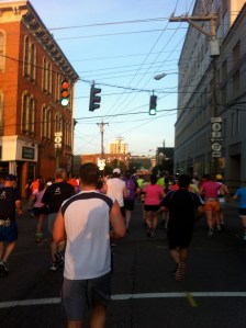 Our pig pen finally started to move towards the start line and soon after we were of running the 2012 Flying Pig Marathon.