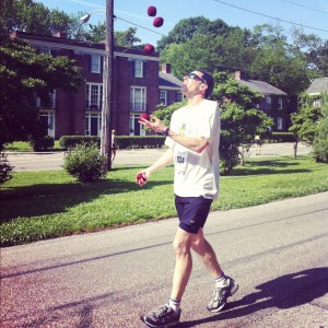 Apparently he had juggled his way through the 10k the previous day and was now on day two of run juggling. I was mesmerized. I even started to run again so I could stay near him longer.
